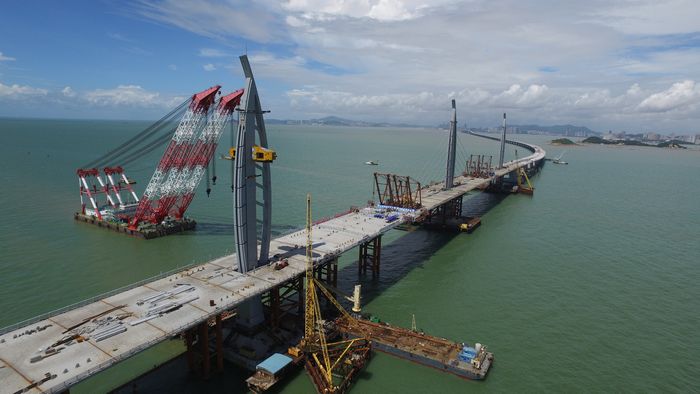 港珠澳大橋總長55公里,是連接香港、珠海和澳門的超大型跨海通道,也是迄今世界最長的跨海大橋,包括海中橋隧主體工程,以及香港、珠海、澳門三地口岸和連接線。其中,主體工程由6.7公里的海底沉管隧道和長達22.9公里的橋梁工程組成,隧道兩端建有東、西兩個人工島。今日將全線貫通的是橫亙在伶仃洋海面上的22.9公里主橋橋梁,無論是從珠海情侶路沿線上看,還是高空俯瞰,宛如一條巨龍綿延在伶仃洋上。