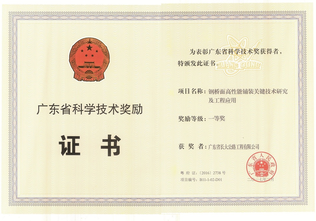 近日,廣東省政府正式頒發(fā)了2016年度廣東省科學(xué)技術(shù)獎(jiǎng)獎(jiǎng)勵(lì)證書。由我公司作為第一完成單位的《鋼橋面高性能鋪裝關(guān)鍵技術(shù)研究及工程應(yīng)用》課題喜獲2016年度廣東省科學(xué)技術(shù)獎(jiǎng)一等獎(jiǎng),并取得了獎(jiǎng)勵(lì)證書。